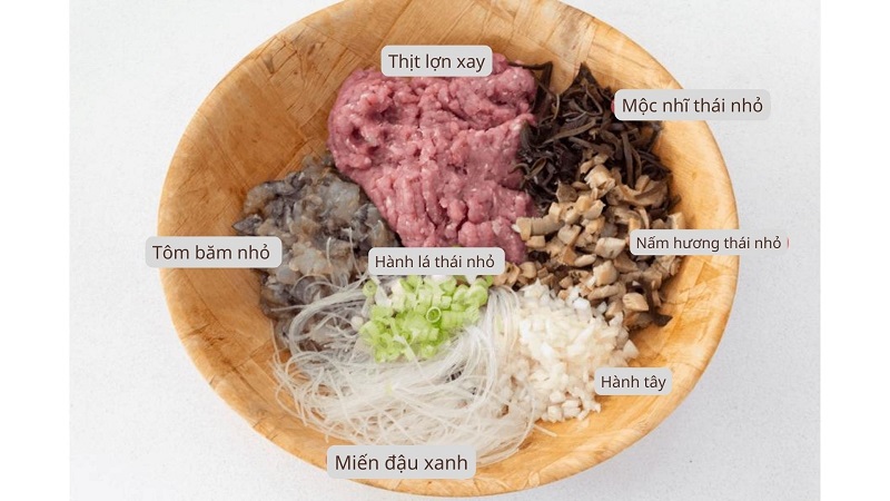 Trộn đều thịt xay, tôm băm nhỏ, mộc nhĩ, nấm hương, hành lá, miến, bột nêm gà, tiêu, muối, đường và nước mắm.