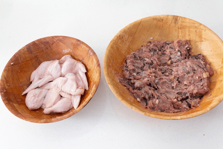Cánh gà sau khi đã rút xương thì ướp cùng nước mắm và bột nêm gà rồi nhồi thịt.