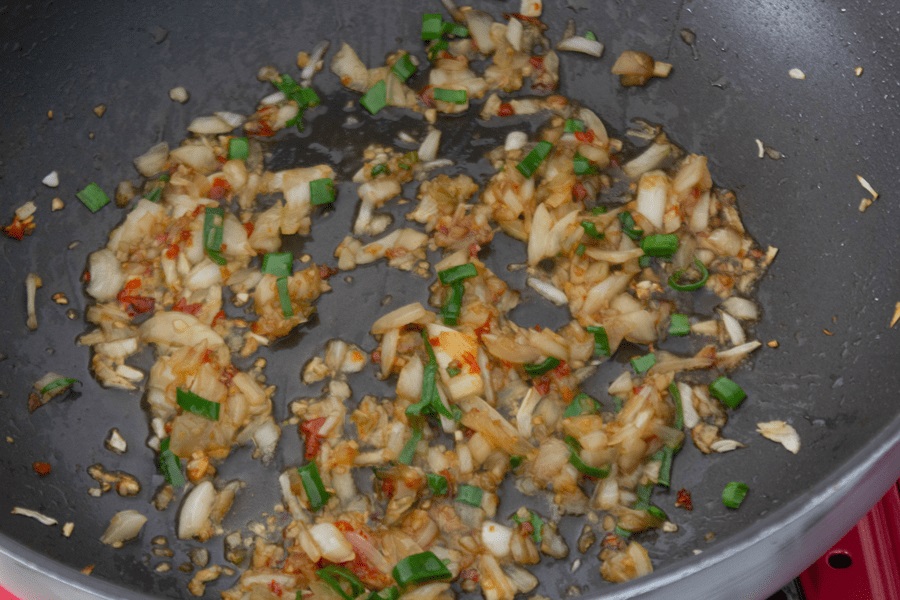 Dùng chiếc chảo mới rán cánh gà (hoặc một chiếc chảo khác) để phi thơm tỏi và hành tây.