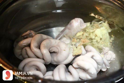 Bắc một cái nồi lên bếp, cho một bát tô nước lạnh vào, thêm gừng đập dập vào và đun sôi. Khi thấy nước sôi thì bạn cho lòng già vào và chần sơ qua.