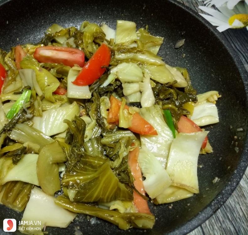 Vẫn giữ nguyên chiếc chảo đấy, bạn cho lượng dầu và hành tỏi còn lại vào phi thơm rồi cho dưa cải muối chua vào xào trong khoảng 5 phút, nêm thêm 1 thìa cà phê hạt nêm đảo đều. Sau đó bạn cho cà chua vào đảo thêm 2 phút. Cuối cùng bạn cho lòng già đã xào vào, thêm bột ngọt, tiêu xay, ớt cay và hành lá vào đảo đều, nấu thêm 2 phút rồi tắt bếp là xong. Lưu ý, bạn không nên xào lòng già quá lâu nó sẽ bị dai đấy, khi ăn sẽ không ngon.
