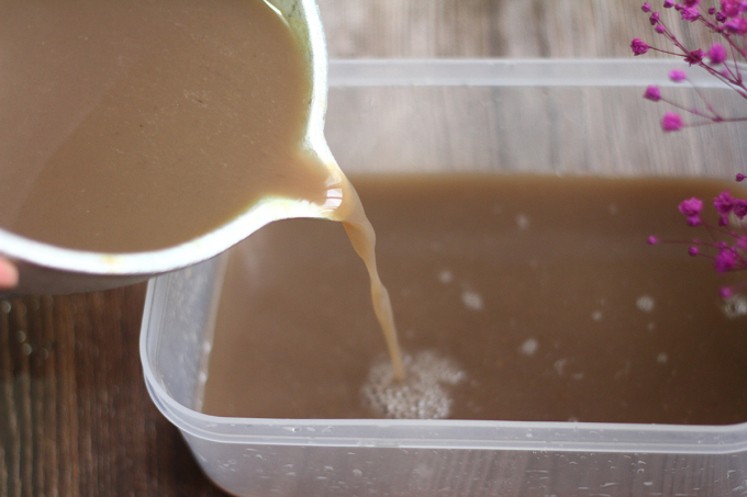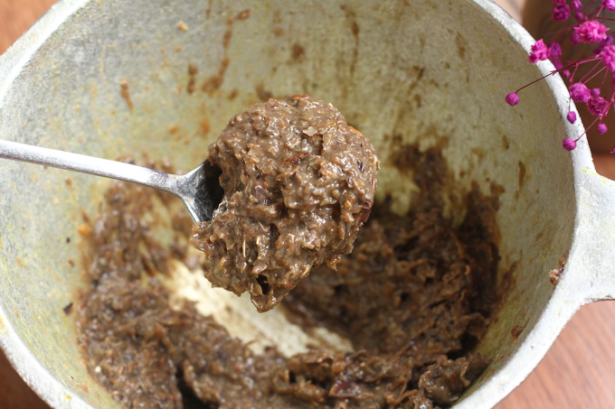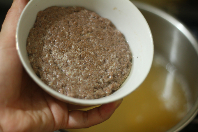 Cho nước vào cối, dùng tay bóp kỹ thịt cua tan ra, để lắng rồi lọc lấy nước. Tiếp tục giã và lọc kỹ vài lần để lấy hết phần thịt cua.