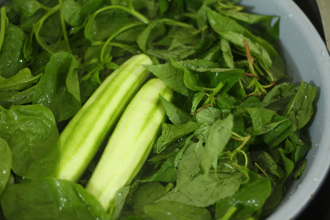 Rau đay, mồng tơi nhặt lá non, rửa sạch, thái nhỏ. Mướp gọt vỏ, thái mỏng.