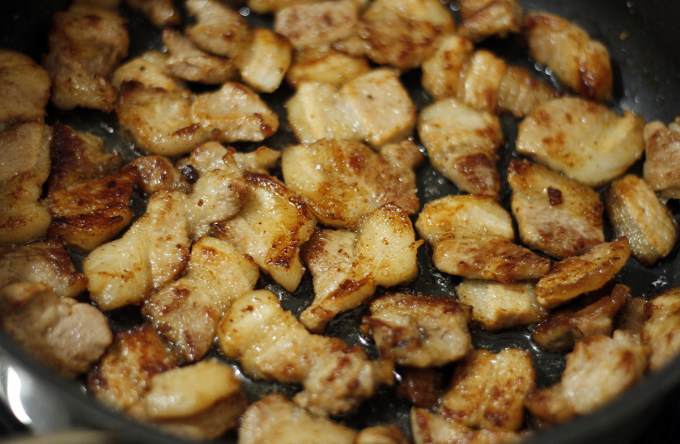 Cho chút dầu ăn vào chảo, trút thịt ba chỉ vào rang cho tới khi xém cạnh và ra bớt mỡ. Múc thịt ra để riêng, còn mỡ trong chảo chừa lại khoảng 2 - 3 thìa để rang tôm.
